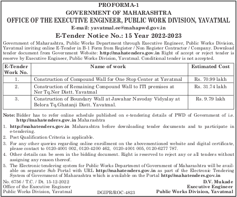 Tender for Construction of Boundary Wall at Jawahar Navoday Vidyalay at Belora Tq.Ghatanji Distt. Yavatmal.