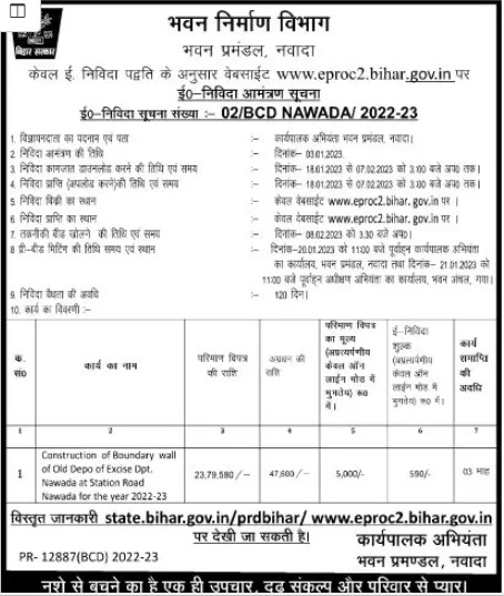Tender for Construction of Boundary wall of Old Depo of Excise Dpt. Nawada at Station Road Nawadia for the year 2022-23