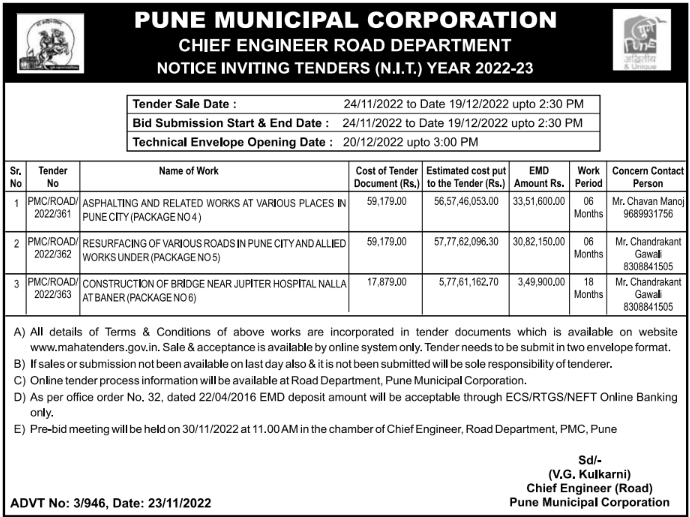 Tender for CONSTRUCTION OF BRIDGE NEAR JUPITER HOSPITAL NALLA AT BANER