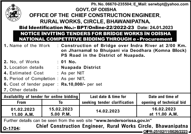 Tender for Construction of Bridge over Indra River at 2/00 Km. on Jharnamal to Bhuipani via Deodhara (Komna Block) PS Road in the District of Nuapada.
