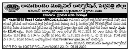 Tender for Construction of BT Road from Kalyaninagar Square to Onion Street to Indo American School Slab Culvert to Medaribasti to Sri Venkateswara Cycle Store (Near Star Flowermel) in Ramagundam Municipal Corporation and Onion Street Turn Construction of slab culvert at (12th call under Urban Development Funds)