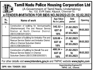 Tender for Construction of building for Ambattur Fire and Rescue Service Station and Ambattur District office in Chennai Suburban District (SE/CC/DB/3284/2021)