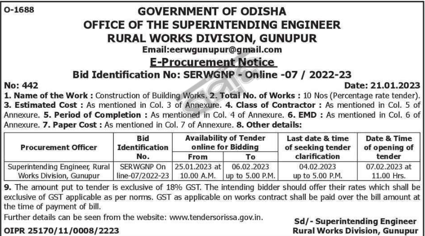 Construction of Building Works. 2. Total No. of Works: 10 Nos (Percentage rate tender).