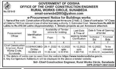 Tender for Construction of Buildings as per Annexure (2 Nos). 2. Class of contractor. “A” Class of (Odisha PWD) or relevant class of other licensing authority. 3. Estimated Cost: Varies from Rs.408.90 Lakhs to Rs.410.34 Lakhs (Approximately). 4. Details projects as per Annexure attached.