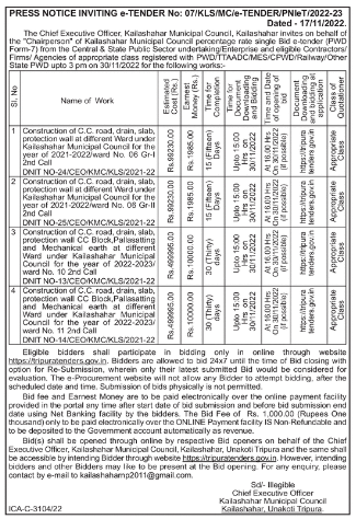 tender for Construction of C.C. road, drain, slab, protection wall at different Werd under Kailashahar Municipal Council