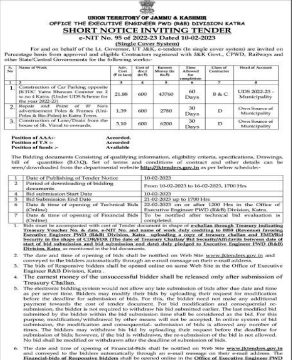 Tender for Construction of Car Parking opposite JKTDC Yatra Bhawan Counter no 2 w.no 4 Katra. (Under UDS Scheme for the year 2022-23)