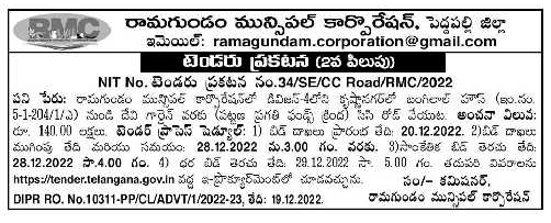 Tender for Construction of CC Road from Bangilal House (I.No. 5-1-204/1/A) to Devi Garden (under Pattana Pragati Funds) at Krishnanagar, Division-4,