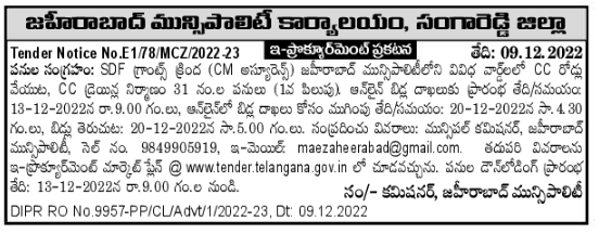 Tender for Construction of CC Roads, Construction of CC Drains in various Wards of Zaheerabad Municipality under SDF Grants (CM Assurance) 31 Nos. of Works (1st Call),