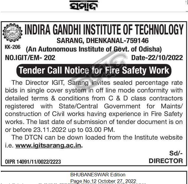 The Director IGIT, Sarang invites sealed percentage rate bids in single cover system in off line mode conformity with detailed terms & conditions from C & D class contractors registered with State/Central Government for Maints/ construction of Civil works having experience in Fire Safety works.