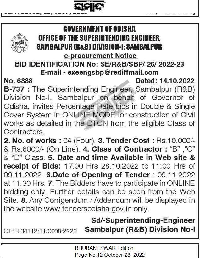 The Superintending Engineer, Sambalpur (R&B) Division No-l, Sambalpur on behalf of Governor of Odisha, invites Percentage Rate bids in Double & Single Cover System in ONLINE MODE for construction of Civil works as detailed in the DTCN from the eligible Class of Contractors.