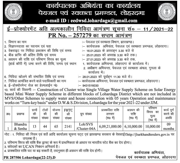 :- Construction of Cluster wise Single Village Water Supply Scheme on Solar Energy based Mini Water Supply Scheme in different blocks of Lohardaga District which are not included in MVS/Other Schemes to supply water and house connection with 05 years Operation and maintenance works on Turn-key basis under D.W.& S.Division, Lohardaga for the year 2021-22 under JJM.