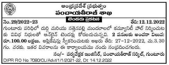Tender for construction of community hall in Durgi and Sattenapalli mandals under Guntur with various funds.