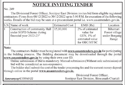 Tender for Construction of community Hall under SOPD Scheme during financial year 2022-23