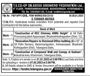 Tender for Construction of Compound Wall and Canopy at Godown, Industrial area, Khammam, Telangana State.