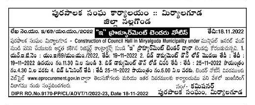 Tender for construction of Council Hall in Miryalguda Municipality under Municipal General Fund.