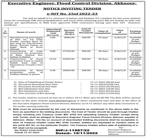 Tender for Construction of crate revetment for protection of Baba Maimal Dev Sathan at Nathal.