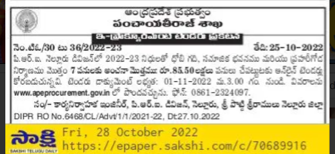 Tender for Construction of dhobi room, community building and guard wall in Nellore division 2022-23 with funds Estimated amount for all 7 works: