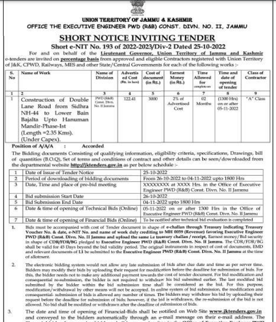 Tender for Construction of Double Lane Road from Sidhra NH-44 to Lower Bain Bajalta Upto Hanuman