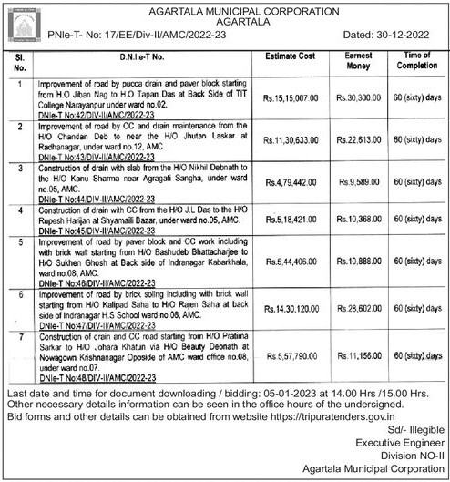 Tender for Construction of drain and CC road starting from HIO Pratima Sarkar to HIO Johara Khatun via HIO Beauty Debnath at Nowagown Krishnanagar Oppside of AMC ward office no.08. under ward no.07. DNIe-T No:48/DIV-II/AMC/2022-23