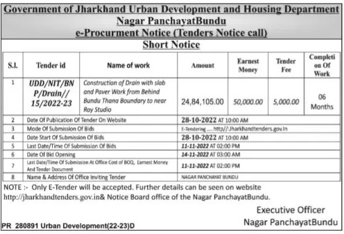 Tender for Construction of Drain with slab and Paver Work from Behind Bundu Thana Boundary to near Roy Studio