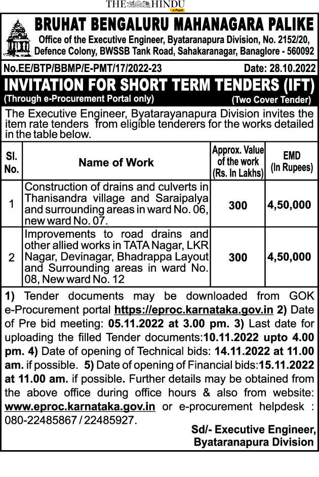 Tender for Construction of drains and culverts in Thanisandra village and Saraipalya and surrounding areas in ward No. 06, new ward No. 07.