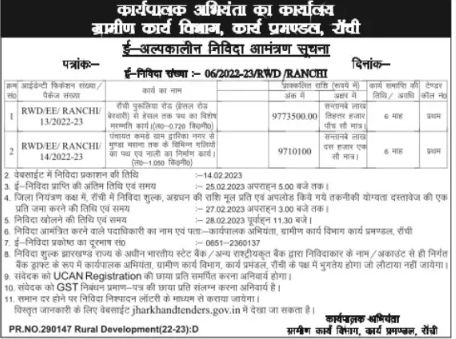 Tender for construction of drains from Munda Manatak. (L-1.050 km) |RWD/EE RANCHI