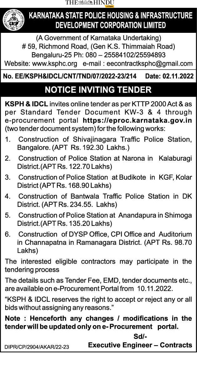 Tender for Construction of DYSP Office, CPI Office and Auditorium in Channapatna in Ramanagara District. (APT Rs. 98.70 Lakhs)