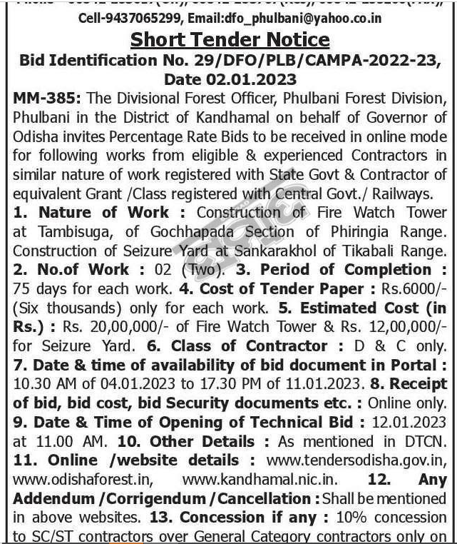 Tender for Construction of Fire Watch Tower at Tambisuga, of Gochhapada Section of Phiringia Range. Construction of Seizure Yard at Sankarakhol of Tikabali Range.