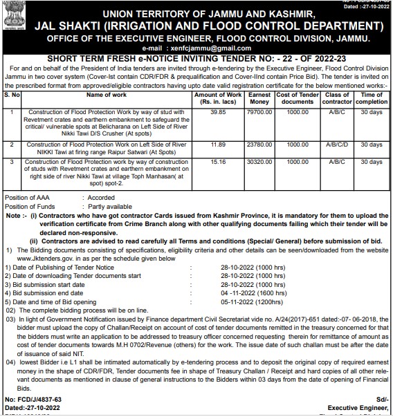 Tender for Construction of Flood Protection work by way of construction of studs with Revetment crates and earther embankment on right side of river Nikki Tawi at village Toph Manhasan( at spot) spot-2.