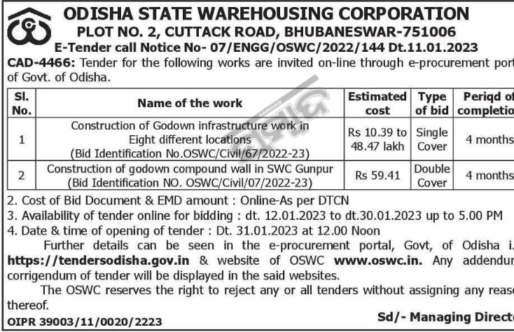 Tender for Construction of godown compound wall in SWC Gunpur (Bid Identification NO. OSWC/Civil/07/2022-23)