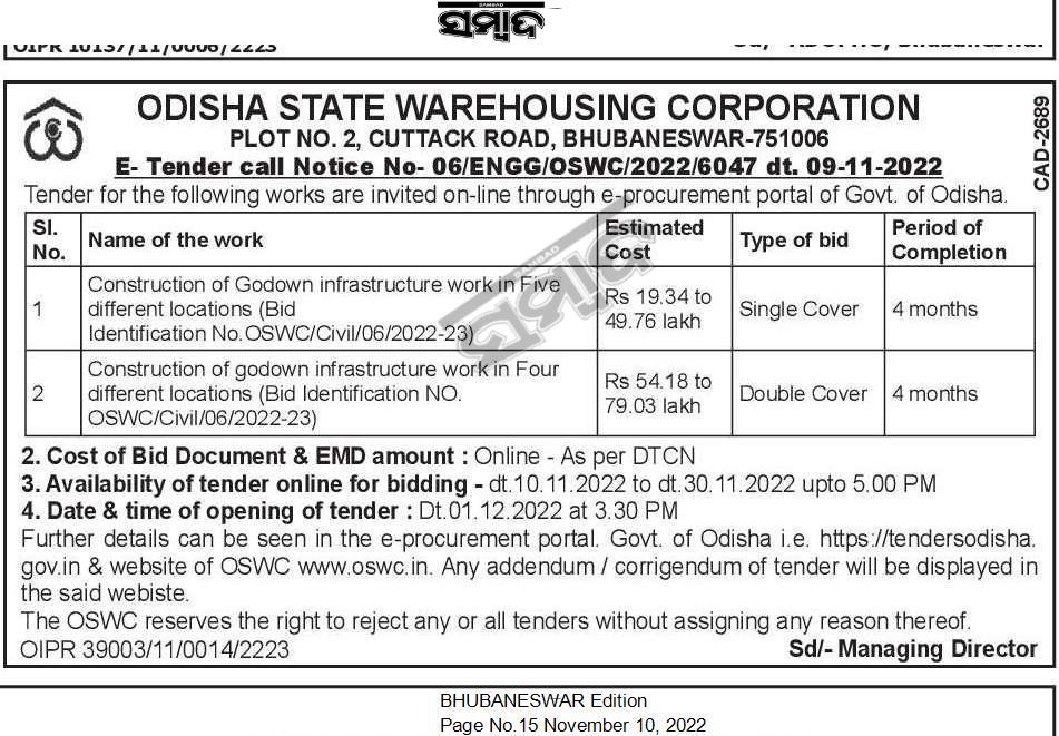 Construction of Godown infrastructure work in Five different locations (Bid Identification No. OSWC/Civil/06/2022-23)