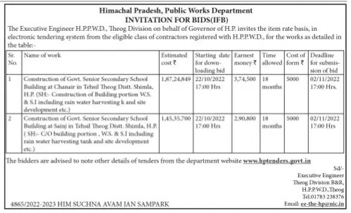 Tender for Construction of Govt. Senior Secondary School Building at Chanair in Tehsil Theog Distt. Shimla, H.P. (SH: Construction of Building portion W.S &&1 including rain water harvesting k and site development etc.)