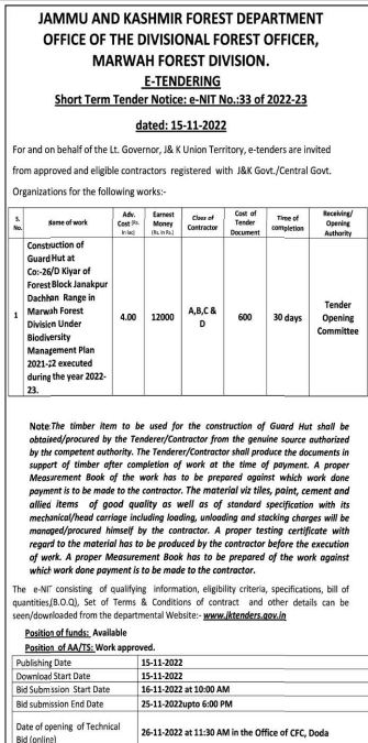 Tender for Construction of Guard Hut at Co:-26/D Kiyar of Forest Block Janakpur Dachhan Range in Marwah Forest Management Plan during the year 2022- 23. Division Under Biodiversity 2021-22 executed