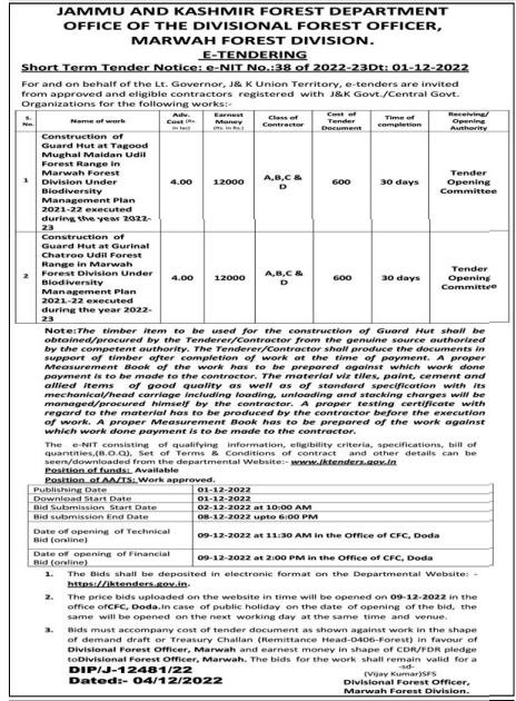 Tender for Construction of Guard Hut at Gurinal Chatroo Udil Forest Range in Marwah Tender Opening Committee 2 Forest Division Under Management Plan 2021-22 executed A,B,C .