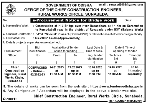 Tender for Construction of H.L.Bridge over river Basandhara at 1 Km on Karamuhan to Kumudabali road in the district of Rayagada under BSY (Balance Work)