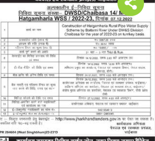 Tender for Construction of Hatgambaria Rural Pipe Water Supply Scheme by Baitarni River Under DW&S Division Chaibasa for the year of] [2022-23 on tunkey basis.