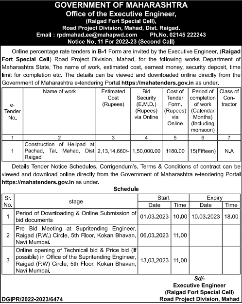 Tender for Construction of Helipad at Tal. Mahad, Dist 1 Raigad