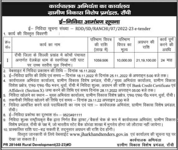 Tender for Construction of high level bridge over Swarnrekha river ghat of Delbera Dham under Koncho Panchayat in Silli block of Ranchi district.