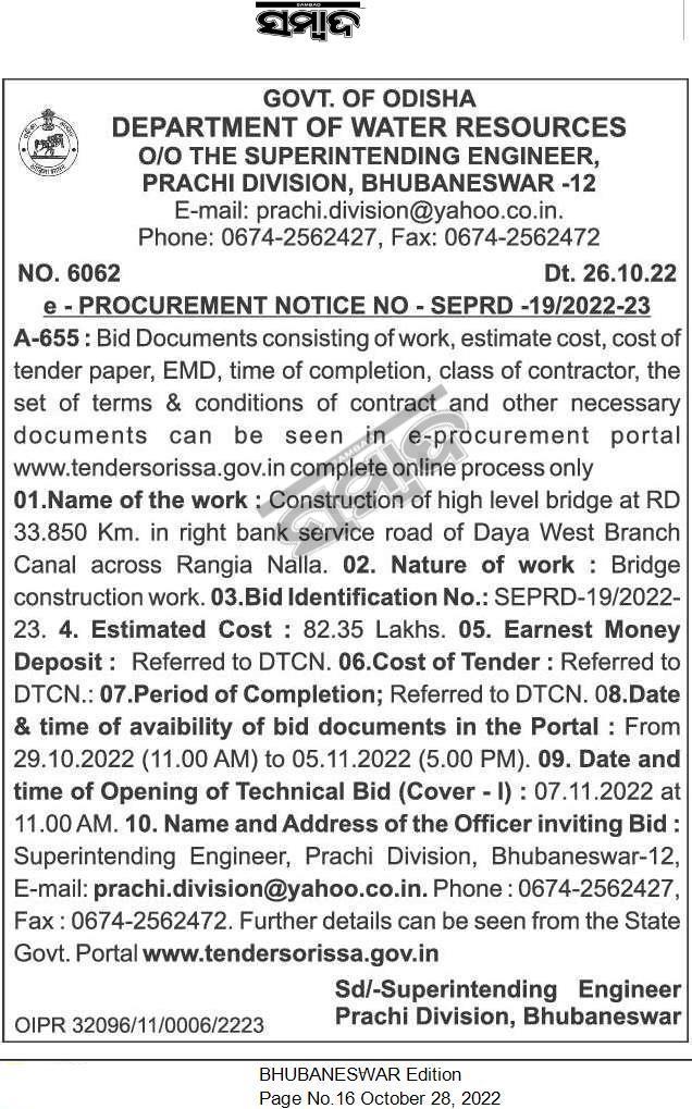 Construction of high level bridge at RD 33.850 Km. in right bank service road of Daya West Branch Canal across Rangia Nalla.