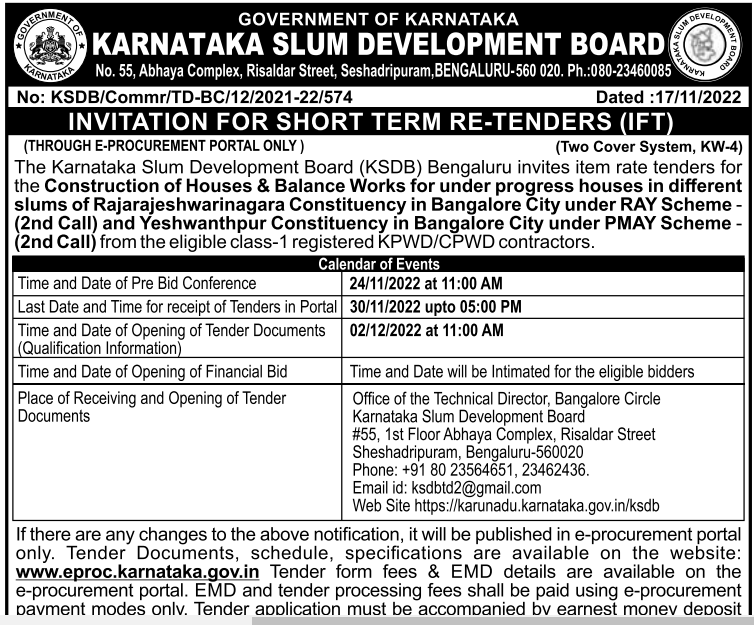 Tender for Construction of Houses & Balance Works for under progress houses in different slums of Rajarajeshwarinagara Constituency in Bangalore City under RAY Scheme – (2nd Call)