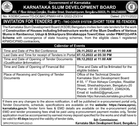 Construction of Houses including Infrastructure works of the Slum Dwellers of Various Slums in Ranibennur, Udupi & Shikaripura Shiralakoppa Town/Cities under PMAY(U)-HFA Scheme