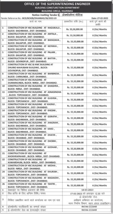 Tender for CONSTRUCTION OF HSC BUILDING AT KUMARDHUBI, BLOCK-NIRSA, DIST-DHANBAD
