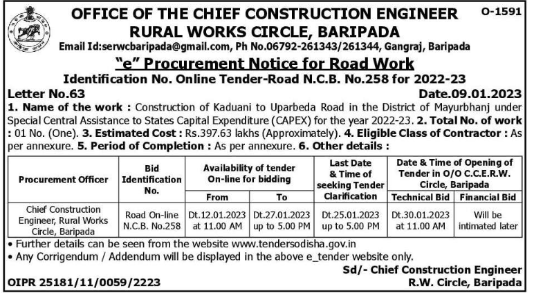 Tender for Construction of Kaduani to Uparbeda Road in the District of Mayurbhanj under Special Central Assistance to States Capital Expenditure (CAPEX)
