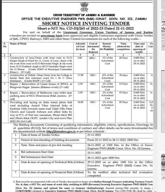 Tender for Construction of lane/Drain with from road to H/O Khajan Singh at Ward No 11, Const. of Lane/drain with tile work from road to H/O Balvinder Singh & tile work from H/O Kashmir singh to H/O Narinder Singh ward No 11 Khour (Under IDMT of Municipal Committe Khour) Cally