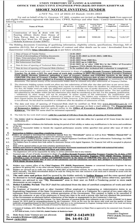 Tender for Construction of lane & drain with tile flooring (60mm thick) from House of Tariq Pervez Butt to House of Mohd 4.64 30 Days