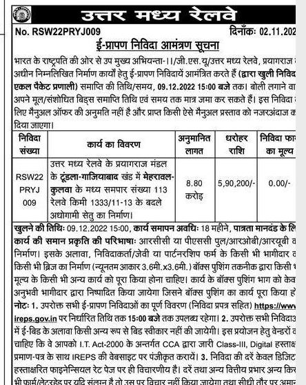 Tender for Construction of level crossing number 113 between Mehrawal Kulwa in Dhundla-Ghaziabad section of Prayagraj Division of North Central Railway.