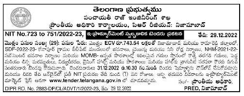 SDF-2022-23- Construction of Lives, Drains and CC Roads in Konapur Village Bibipet Mandal: NHM-2021-22- Construction of Sub Center Buildings and MOMB- Burned classrooms replacing dilapidated rooms in High Schools, major and minor repairs, electrification. Some of the undersigned are seeking tenders for dining halls and schools and hall drinking water supply.
