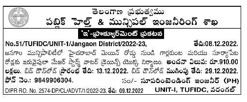 Tender for Construction of Major Storm Water Drains on both sides of Garlakunta and Suryapet Roads from Hyderabad Main Road in Janagam