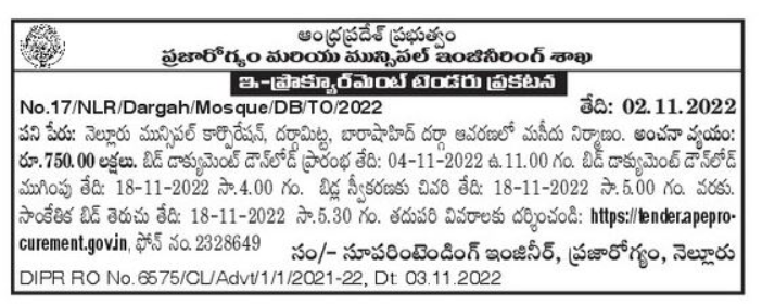 Tender for Construction of Masjid in Nellore Municipal Corporation, Dargamitta, Barashahid Dargah premises.