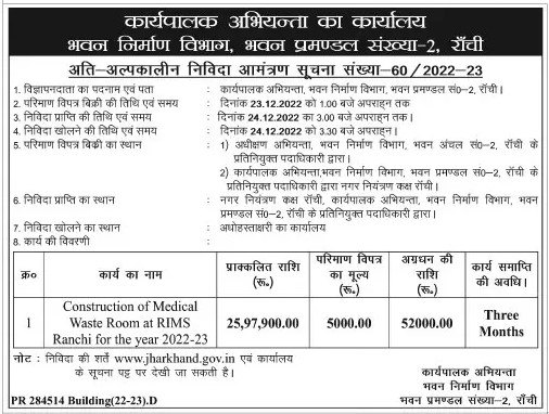 Tender for Construction of Medical Waste Room at RIMS Ranchi for the year 2022-23